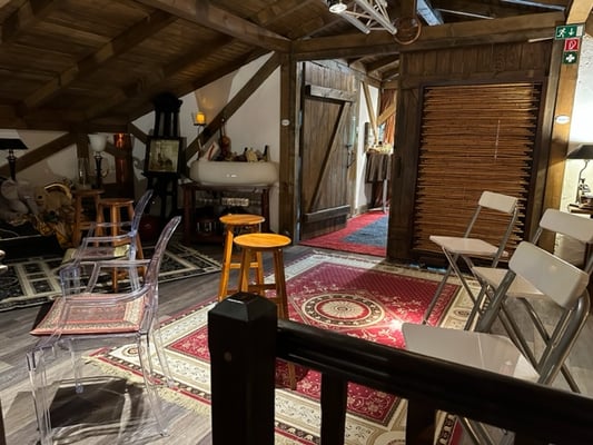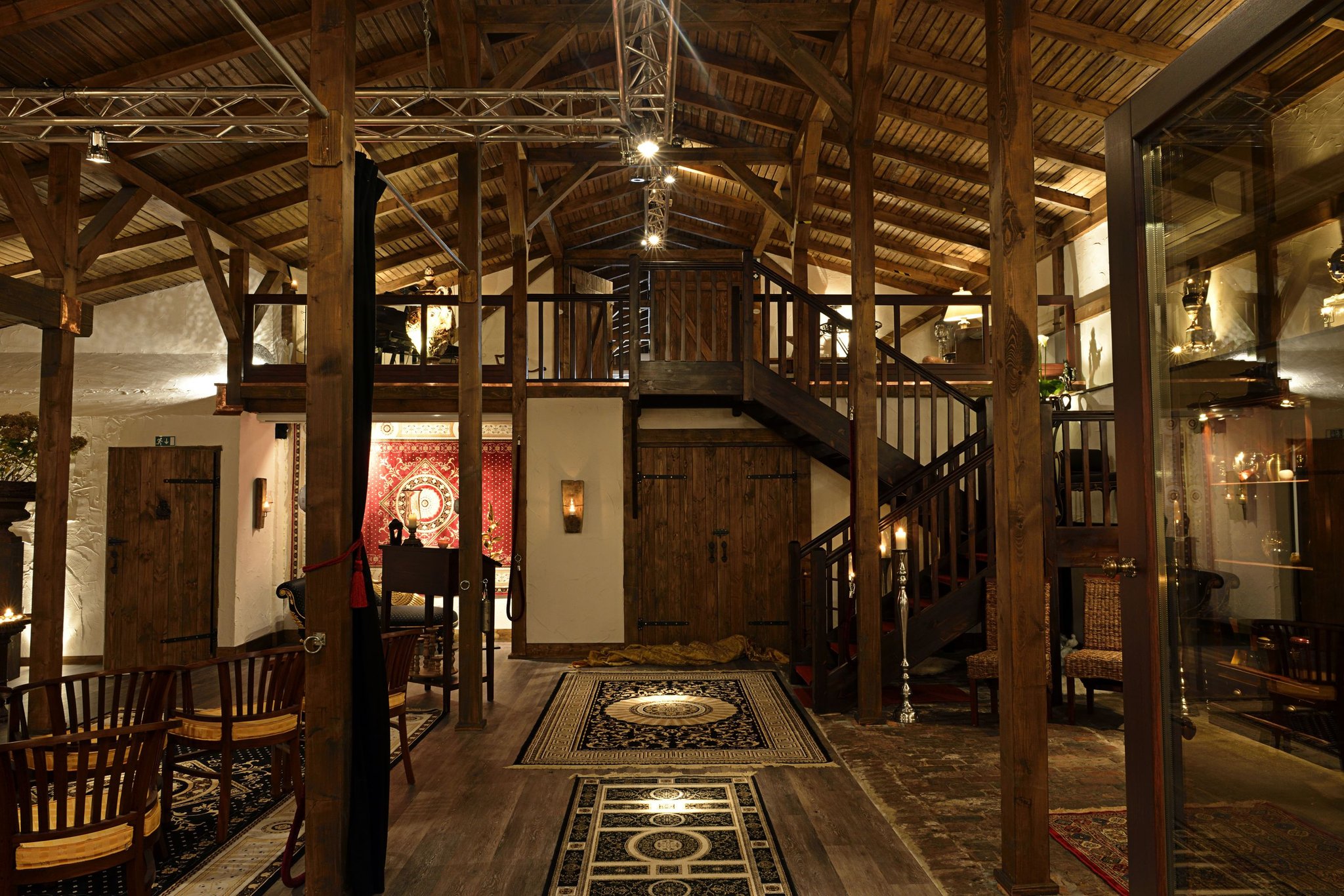 Treppe sowie Fahrstuhl sind vorhanden (Gebäude und Gelände sowie WCs bedingt barrierefrei), Parkplatz ca. 50m vom Gebäude entfernt (Tenne und Gastraum sind klimatisiert max. 80/90 Personen)