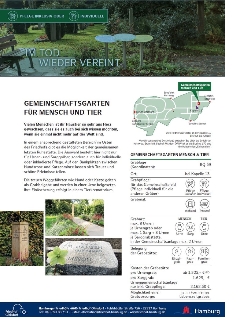 Vielen Menschen ist ihr Haustier so sehr ans Herz gewachsen, dass sie es auch bei sich wissen möchten, wenn sie einmal nicht mehr auf der Welt sind. In einem ansprechend gestalteten Bereich im Osten des Friedhofs gibt es die Möglichkeit der gemeinsamen letzten Ruhestätte. Die Auswahl besteht hier nicht nur für Urnen- und Sarggräber, sondern auch für individuelle oder inkludierte Pflege. Auf den Bankplätzen zwischen Hundsrose und Katzenminze lassen sich Trauer und schöne Erlebnisse teilen. Die treuen Weggefährten wie Hund oder Katze gelten als Grabbeigabe und werden in einer Urne beigesetzt. Ihre Einäscherung erfolgt in einem Tierkrematorium. Die Friedhofsgärtnerei an der Kapelle 13 betreut die Anlage. Verkehrsanbindung: Die Anlage erreichen Sie über die Einfahrten Kornweg, Bramfeld, Seehof. Mit dem ÖPNV ist es die Busline 170 und die Haltestellen „Eichenallee“. Eingfahrt Kornweg Einfahrt Bramfeld Einfahrt Seehof Einfahrt Fuhlsbüttler Straße Forum Ohlsdorf Gemeinschaftsgarten Mensch und Tier Kapelle 13 GEMEINSCHAFTSGARTEN MENSCH & TIER Grablage (Koordinaten): BQ 69 Ort: bei Kapelle 13 Grabpflege: für das Gemeinschaftsfeld (Pflege individuell für die anderen Gräber) Grabmal: Grabart: max. 8 Urnen je Urnengrab oder max. 1 Sarg + 8 Urnen je Sarggrabstätte, in der Gemeinschaftsanlage max. 2 Urnen Belegung der Grabstätte: Kosten der Grabstätte pro Urnengrab: ab 1.325,– € ab pro Sarggrab: 1.625,– € Urnengemeinschaftsanlage nur inkl. Grabpflege: 2.162,50 € Möglichkeit einer Grabvorsorge: ja, in Form eines Lebenszeitgrabes Pflege inklusiv stehend liegend MENSCH TIER Pflege individuell Urne Sarg Urne Familiengrab Paargrab Einzelgrab. Wir beraten Sie, rufen Sie uns an 040 590565