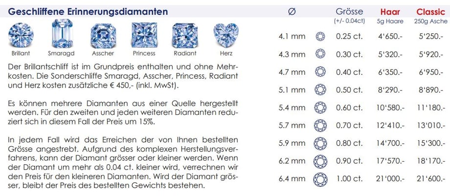 Die Erinnerungsdiamanten werden über uns angeboten. Eine Preisübersicht finden Sie weiter unten.